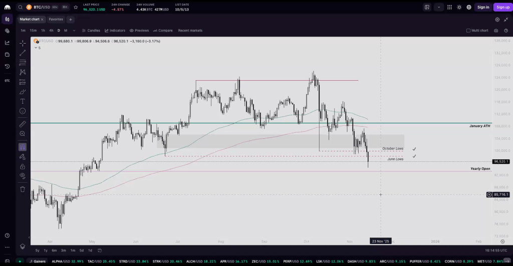 BTC: Sitting on a do-or-die zone around the yearly open / 3D 100-EMA. Fast reclaim → relief; slow drift + failed reclaims → caution. Cautious bulls view the 94-98k range as a last stand support level, with invalidation on a clean breakdown that fails to spring.